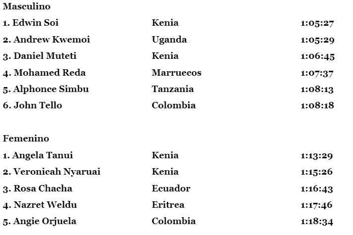 Un final apasionante protagonizado por Edwin Soi (Kenia) y Andrew Kwemoi (Uganda) en los últimos metros de la prueba, en el que tuvieron un tropiezo por una confusión de Soi, pero afortunadamente no cayeron al piso. Soi cruzó la meta en el Parque Simón Bolívar con un tiempo de 1 hora, 5 minutos y 27 segundos. Dos segundos más tarde, Andrew Kwemoi finalizó en segundo lugar, que se caracterizó por su camiseta color naranja y peculiar postura inclinada hacia adelante.