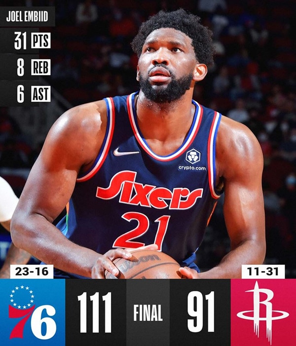 El estelar camerunés Joel Embiid ayudó sobremanera este lunes en la NBA a los Philadelphia 76ers en victoria sobre los Houston Rockets, mientras que el astro Giannis Antetokounmpo no pudo llevar al éxito a los campeones defensores Milwaukee Bucks. Embiid anotó 31 puntos y ocho rebotes y sus Sixers ganaron su séptimo juego consecutivo al someter 111-91 sobre los Houston Rockets.