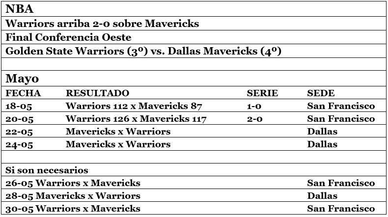 Levantando una desventaja de 19 puntos, los Golden State Warriors se impusieron el viernes 126-117 a los Dallas Mavericks de Luka Doncic y se adelantaron 2-0 en la final de la Conferencia Oeste de la NBA.