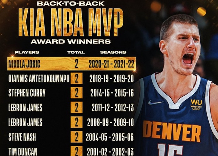 Jokic es el decimotercer jugador de la historia en lograr el galardón en temporadas consecutivas y apenas el quinto pívot en lograrlo, uniendo su nombre a los legendarios Bill Russell, Wilt Chamberlain, Kareem Abdul-Jabbar y Moses Malone.