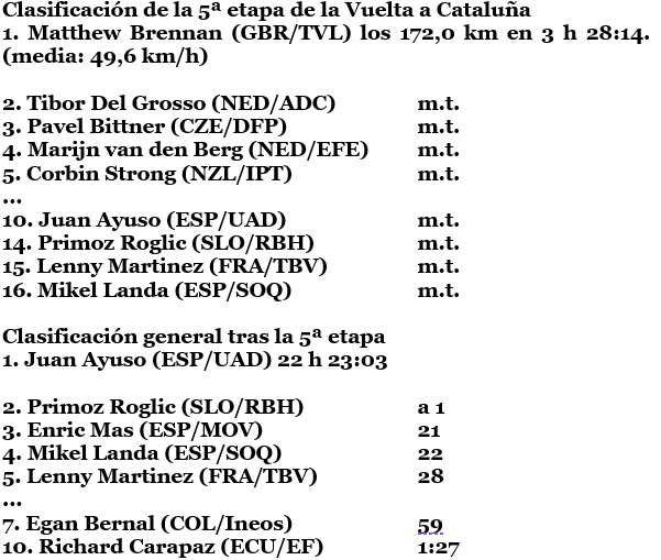 La sexta y penúltima etapa, el sábado, recorrerá 159 kilómetros y destaca por cuatro puertos, uno de ellos especial y otros dos de primera categoría, entre Berga y Queralt.