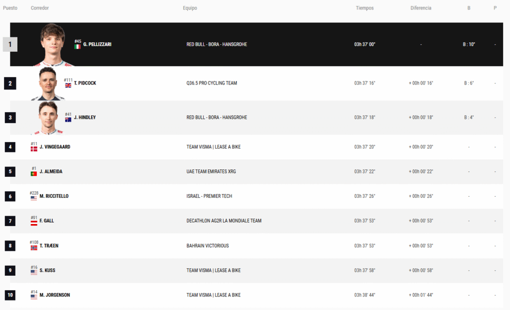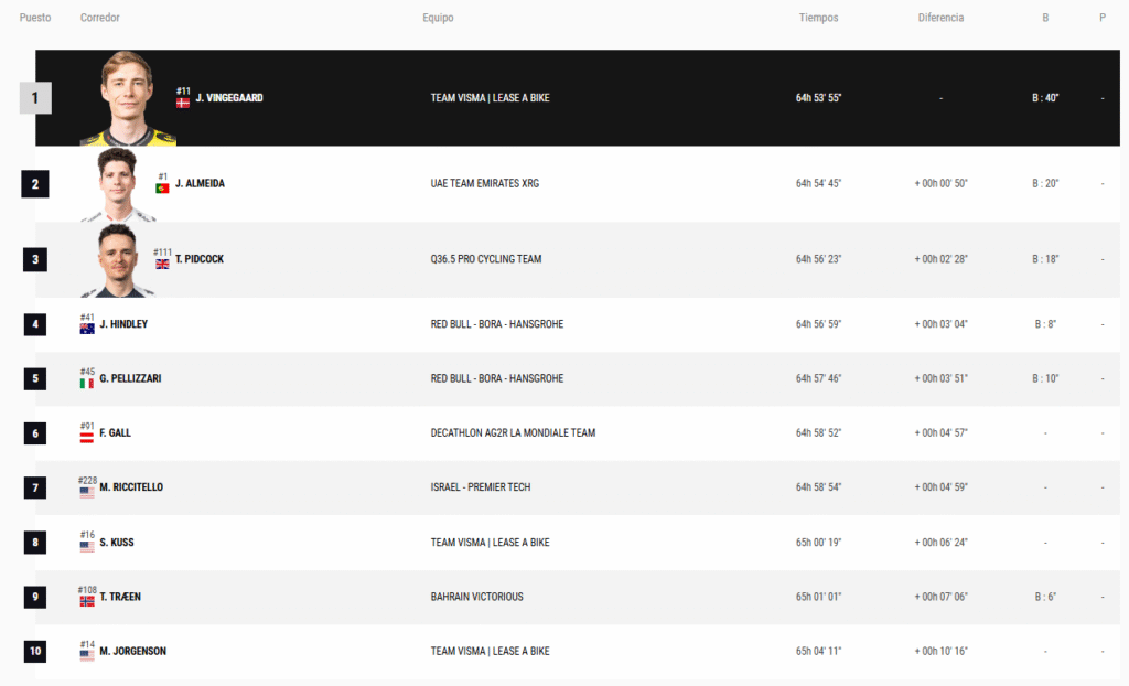 Clasificación tras 17 etapas, Jonas Vingegaard líder, 2º Joao Almeida, 3º Tom Pidcock