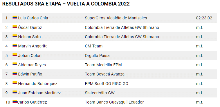 En la clasificación general, Luis Carlos Chía (SuperGiros-Alcaldía de Manizales) aumentó su ventaja con sus rivales y ahora comanda las posiciones seguido de Nelson Soto (Colombia Tierra de Atletas GW Shimano) a 10″ y de Óscar Quiroz (Colombia Tierra de Atletas GW Shimano) a 16″.
