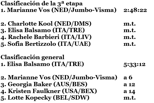 En esta última etapa en Cerdeña, Vos, ganadora del Giro femenino en 2011, 2012 y 2014, superó a su compatriota Charlotte Kool (DSM) y a Balsamo (Trek-Segafredo). Ahora está a sólo seis segundos de la líder de la general. La australiana Georgia Baker completa el podio provisional.