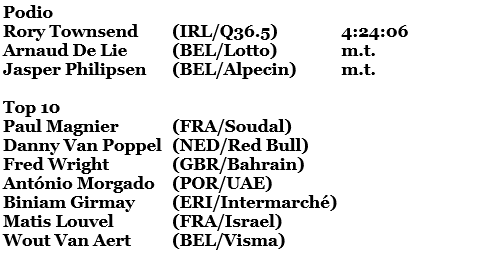El irlandés Rory Townsend (Q36.5 Pro Cycling Team) dio la sorpresa del día al llevarse la victoria. ¡Un auténtico batacazo! Se mantuvo en la fuga desde el inicio y resistió el empuje del pelotón, cruzando la meta en solitario con un tiempo de 4:24:06. Es su primera victoria en una prueba UCI WorldTour, ¡y qué manera de estrenarse!