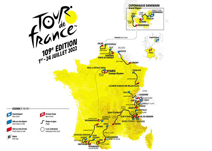 Recorrido: 3.350 km. Salida el 1 de julio desde Copenhague. Llegada el 24 de julio en París.