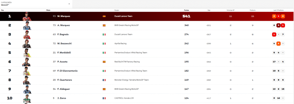 Clasificación del MotoGP, 1º Marc Márquez, 2º Alex Márquez, 3º Francesco Bagnaia