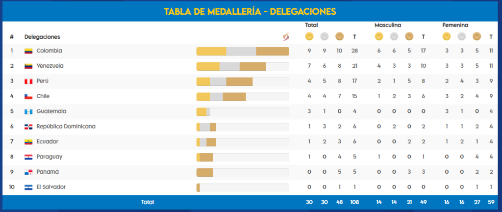 Las medallas de oro llegaron con la bolichera María José Rodríguez, los patinadores María Fernanda Tims, Stiven Villegas y Andrés Jiménez, el gimnasta Andrés Martínez y el equipo masculino de gimnasia y el judoca John Jairo Futínico.