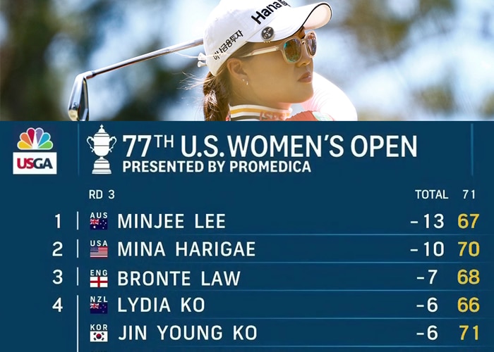 La australiana Minjee Lee terminó este sábado con un cartón con 67 golpes, cuatro bajo par, para establecer un récord de puntuación en 54 hoyos y tomar una ventaja de tres impactos tras la tercera ronda del 77º Women’s Open, segundo Grand Slam del año en el golf femenino (LPGA).