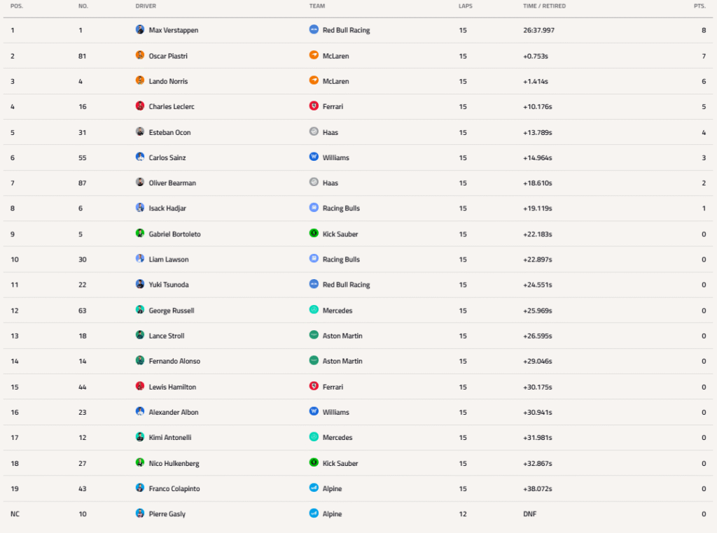 Charles Leclerc (Ferrari) terminó cuarto, seguido por Esteban Ocon (Alpine) en quinto y Carlos Sainz (Williams) en sexto. Oliver Bearman (Haas) e Isack Hadjar (Racing Bulls) cerraron las posiciones puntuables en séptimo y octavo, respectivamente.