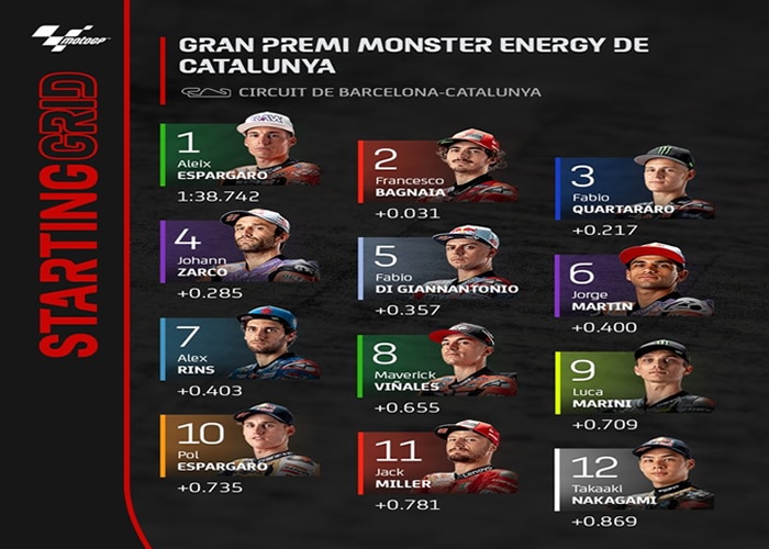 Tras los tres primeros, la segunda línea de la parrilla — 100% Ducati — estará ocupada por el francés Johann Zarco (Ducati-Pramac), cuarto, por delante del italiano Fabio Di Giannantonio (Ducati-Gresini), y el otro piloto Ducati Pramac, el español Jorge Martín.